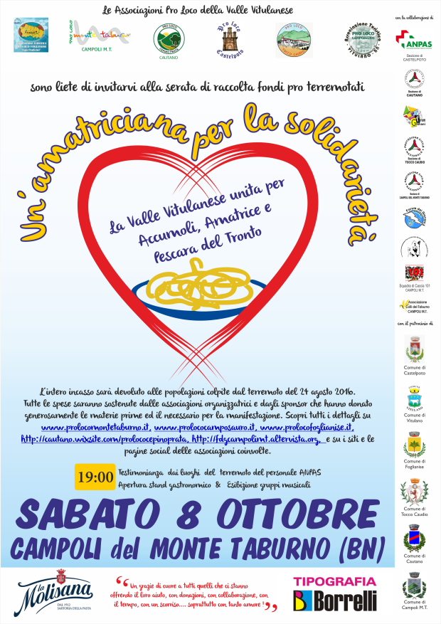 La Pro Loco Monte Taburno, insieme alle altre associazioni locali della Valle Vitulanese, organizza una serata di raccolta fondi per le popolazioni colpite dal sisma del 24 agosto scorso. L’evento, “Un’amatriciana per la solidarietà”, si svolgerà
